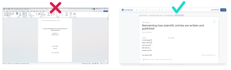 MyST (https://mystmd.org) is an open-source markup language designed for scientific documents. Curvenote is Word-style WYSIWYG editor built on top of open-source MyST. Articles written in MyST or Curvenote can be exported to any format including , JATS and Word, and are thereby more future-compatible.